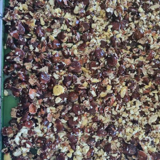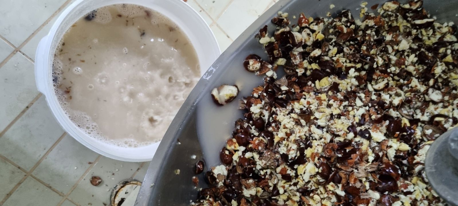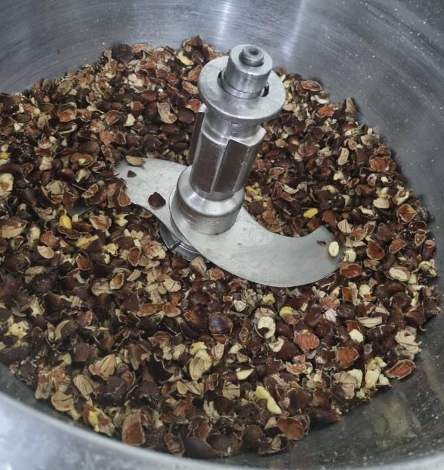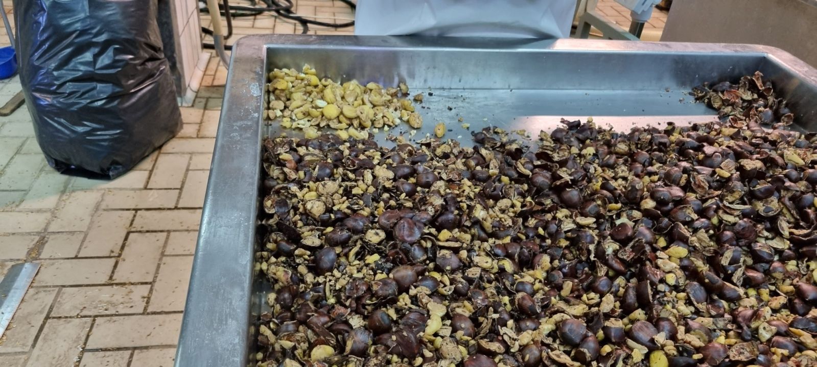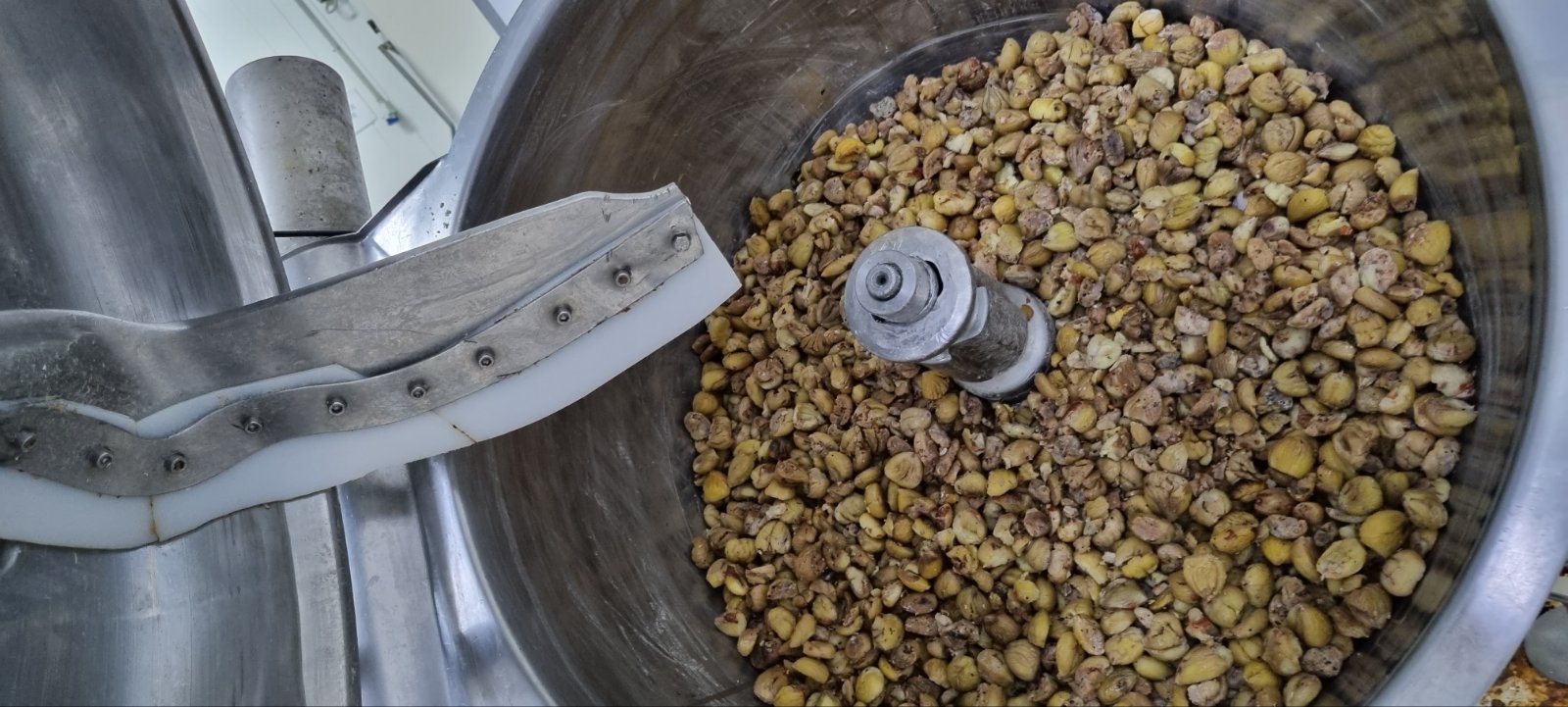 Α’ Φάση αποφλοίωσης – Ανάδευση των τεμαχισμένων κάστανων με στόχο το μηχανικό διαχωρισμό του φλοιού.