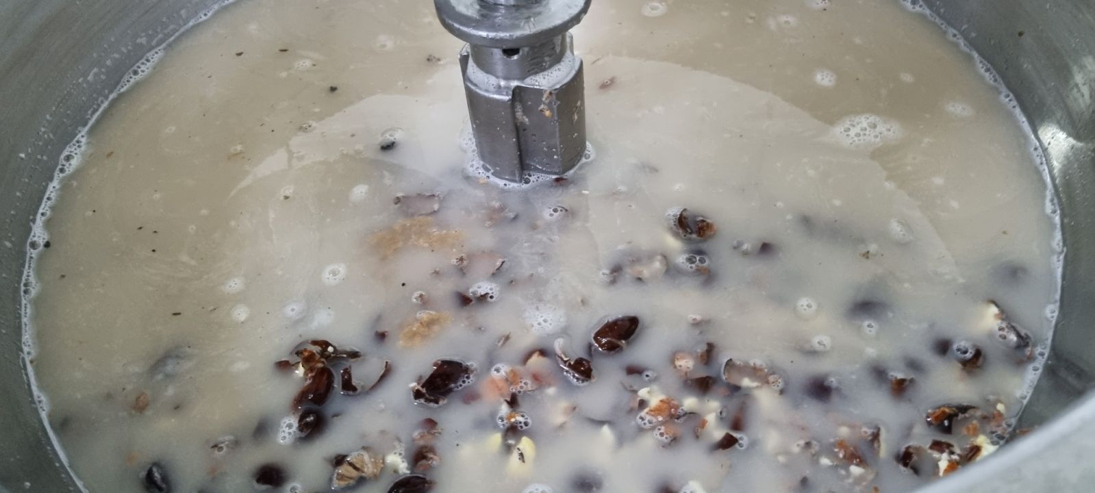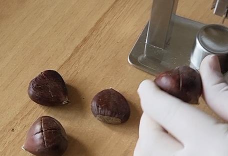 Τεμαχισμός κάστανων στον πολτοποιητή, με προσθήκη νερού, και στο τέλος της διεργασίας το νερό αφαιρείται (αντλία κενού).